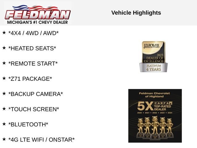 *4X4 / 4WD / AWD*, *HEATED SEATS*, *REMOTE START*, *Z71 PACKAGE*, *BACKUP CAMERA*, *TOUCH SCREEN*, *Bluetooth®*, *4G LTE WIFI / ONSTAR*, *SATELLITE RADIO SIRIUS XM*, *LOCAL TRADE*, *VEHICLE LOCATED AT FELDMAN CHEVROLET OF HIGHLAND CALL (248) 889-3232*, *GENERAL MOTORS AWARD TOP CUSTOMER SERVICE DEALERSHIP IN METRO DETROIT*, 6-Speed Automatic Electronic with Overdrive, 4WD, Black Cloth.