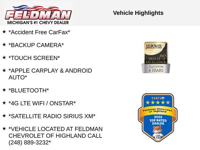 *Accident Free CarFax*, *BACKUP CAMERA*, *TOUCH SCREEN*, *APPLE CARPLAY & ANDROID AUTO*, *Bluetooth®*, *4G LTE WIFI / ONSTAR*, *SATELLITE RADIO SIRIUS XM*, *VEHICLE LOCATED AT FELDMAN CHEVROLET OF HIGHLAND CALL (248) 889-3232*, *GENERAL MOTORS AWARD TOP CUSTOMER SERVICE DEALERSHIP IN METRO DETROIT*.