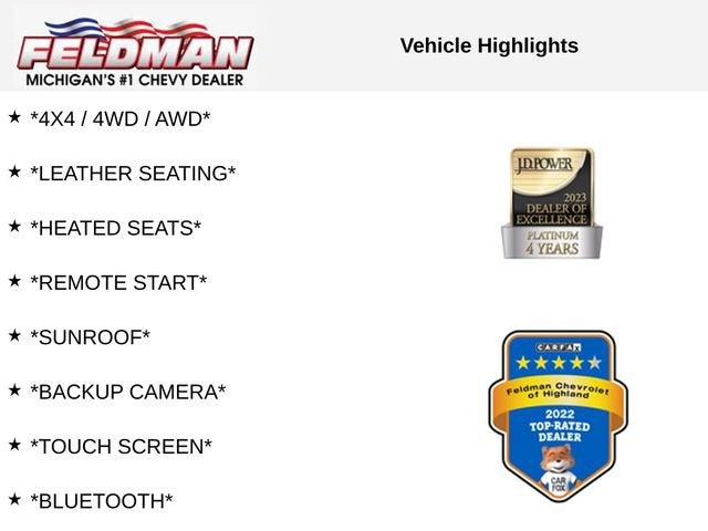 *4X4 / 4WD / AWD*, *LEATHER SEATING*, *HEATED SEATS*, *REMOTE START*, *SUNROOF*, *BACKUP CAMERA*, *TOUCH SCREEN*, *Bluetooth®*, *SATELLITE RADIO SIRIUS XM*, *LOW MILES*, *VEHICLE LOCATED AT FELDMAN CHEVROLET OF HIGHLAND CALL (248) 889-3232*, *GENERAL MOTORS AWARD TOP CUSTOMER SERVICE DEALERSHIP IN METRO DETROIT*.